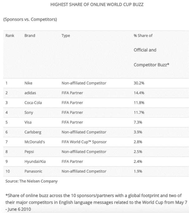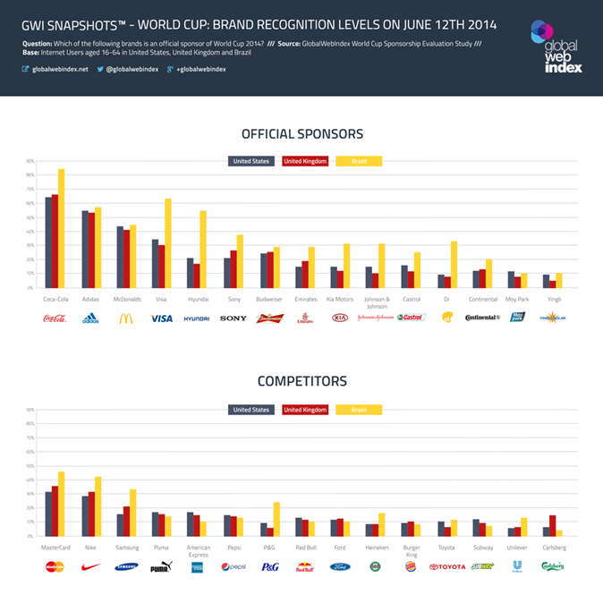 While none of the competitor brands are officially linked to FIFA, they are all heavily present throughout sports in form of various partnerships, suggesting that perhaps an association with the tournament or football in general is sufficient to benefit from the World Cup fever.